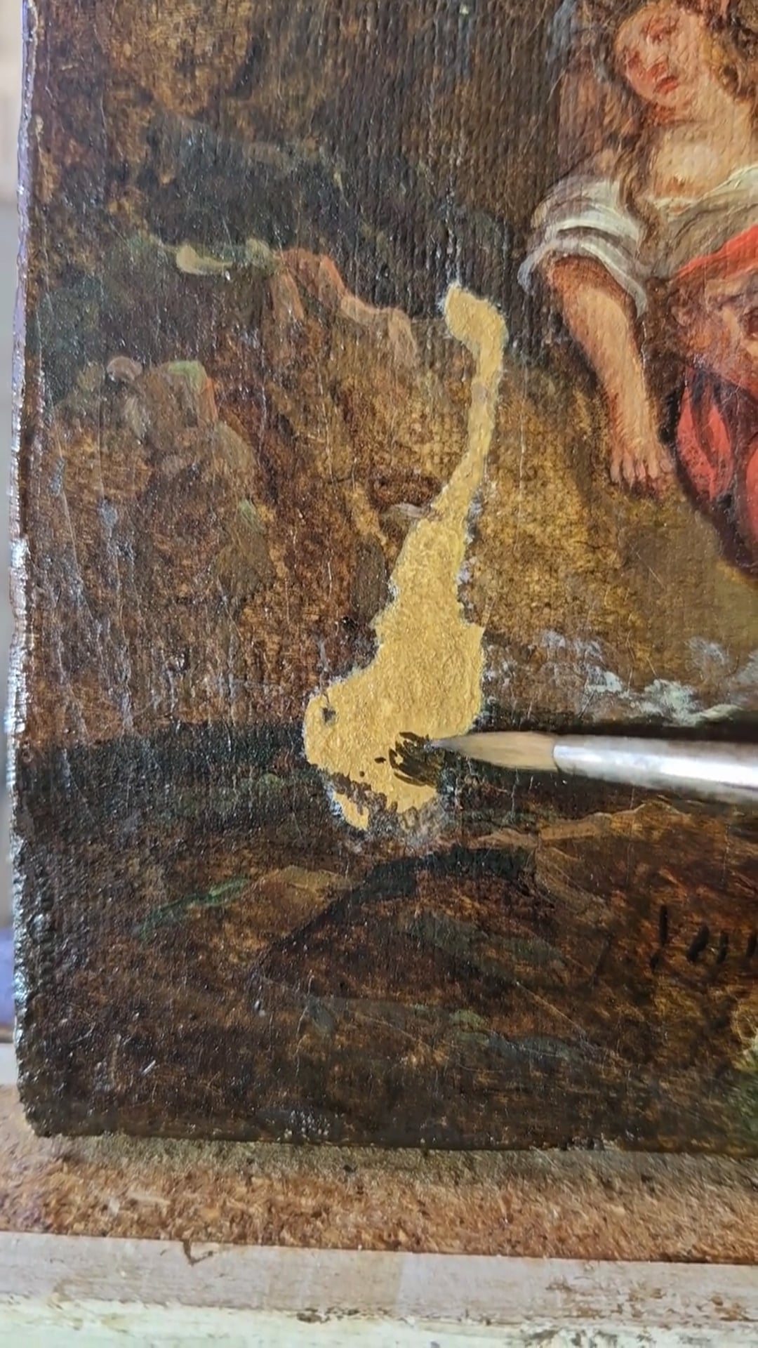 Les opérations de conservation terminées j’ai pu intervenir sur la couche picturale. Elle présentait plusieurs altérations : une épaisse couche de crasse, un vernis oxydé devenu très jaune, des repeints et des mastics d’une précédente restauration. Ils étaient dénaturés et débordants sur la couche picturale.