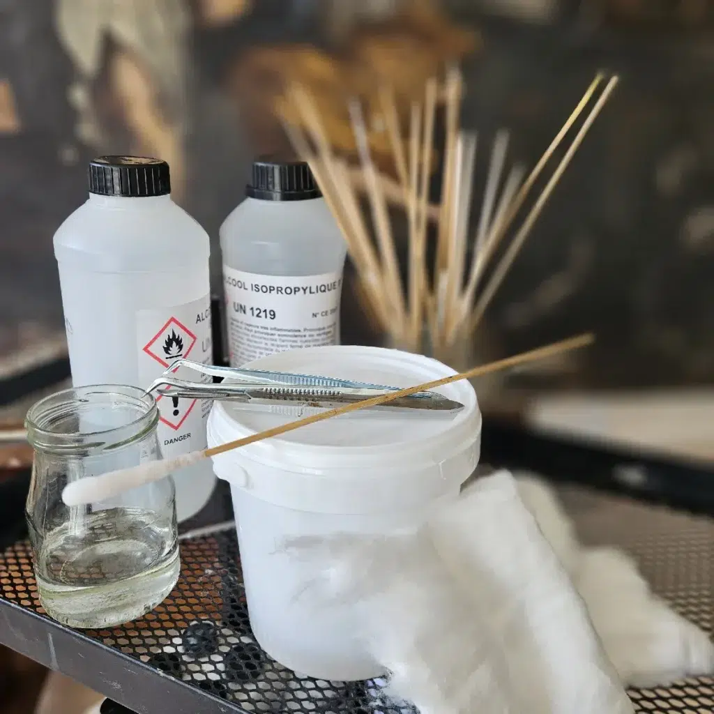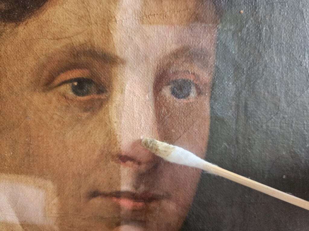 C’est donc après un examen approfondi, une batterie de tests et avec des techniques bien appréhendées que nous pouvons commencer le nettoyage, usant d’un large choix de mélanges de solvant (solvants organiques, oléorésines, hydrocarbures aliphatiques, aromatiques et chlorés, des alcools, des cétones, des éthers…) à des concentrations plus ou moins fortes selon les cas et après des tests.
