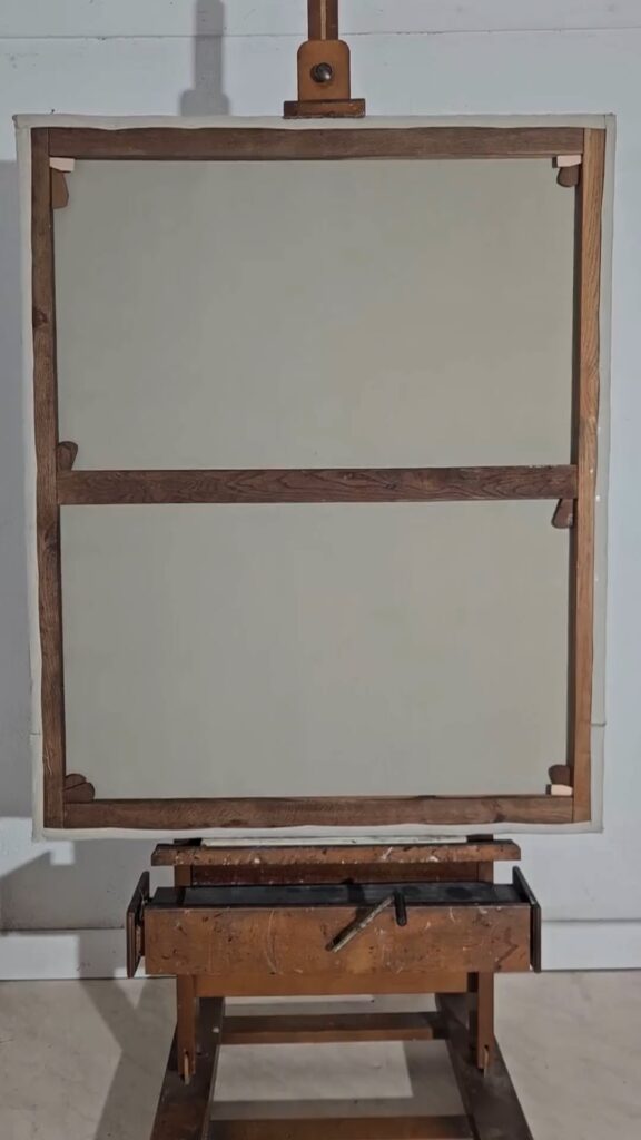 La toile originale de ce tableau a été affaibli par de nombreuses ruptures de toile et une ancienne restauration qui a mal vieilli. Le retrait de la toile de rentoilage et des résidus de colle a aussi fragilisé le support. En effet, la toile originale avait perdu sa souplesse et sa résistance mécanique. Le collage d’un nouveau renfort était indispensable. J’ai opté pour un doublage synthétique léger.